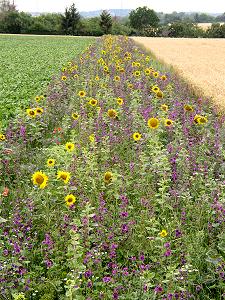 Zwei Buntbrache - Streifen zwischen Äckern im Gewann Kräutlen Es handelt sich um zwei Streifen von jeweils 5 Meter Breite und 250 Meter Länge im Gewann Kräutlen mit einer Gesamtfläche von 2 500 m².Die Naturschutzziele sind hier insbesondere die Förderung der Feldfauna wie Rebhuhn und Feldhase, indem den Tieren zur Aufzucht und Deckung zwei von Wegen abgelegene Flächen zwischen Äckern angeboten werden. Die Buntbrachestreifen bieten einen gewissen Schutz vor Spaziergängern und Hunden. Die Keimung der Ansaat hat sich in diesem Frühjahr wegen der kühlen Witterung und der Trockenheit etwas verzögert. Als Saatgut wurde eine "Wildacker-/ Buntbrachemischung" gewählt. Sie enthält insbesondere hochwüchsige ein- und mehrjährige Arten wie Malven, Sonnenblumen oder Rainfarn, die auch im Winter Deckung bieten. Sie enthält auch viele Arten (z.B. Lein, Buchweizen etc.), die Samen für durchziehende Vögel (Ammern, Stieglitze, Finken) bieten. Die vorgesehene Pflege beinhaltet einen Räumschnitt im Frühjahr, im Winter bleibt die Brache stehen!