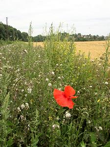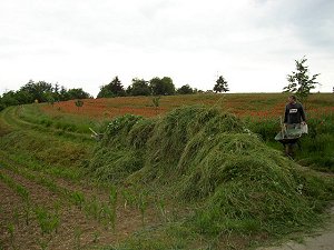 Die Landwirte berichten, dass leider immer noch Spaziergänger mit Hunden entlang der Streifen laufen. Herr von Zimmermann schlägt daher vor, die Streifen mit einem Hinweisschild zu versehen, um den Schutz zu gewährleisten und den Bürgern den Naturschutzzweck zu vermitteln. Wegbegleitende Grünlandstreifen Römerweg, Bisachgraben, Feuerbacher Tal Es handelt sich um 3 m breite Streifen beidseitig bzw. einseitig der landwirtschaftlichen Wege. Folgende Vorteile werden erwartet: Schutz der Äcker vor Fußgängern und Hunden, Ausweichmöglichkeiten für landwirtschaftliche Maschinen, Erosionsschutz für Lössäcker. Ökologische Anreicherung durch Wiesen- und Krautsäume; optische Aufwertung der Feldflur. Als Pflege ist vorgesehen: Ein Meter breiter Mulchstreifen mit Kurzgras direkt am Weg und anschließend ein zwei Meter breiter höherwüchsiger, kräuterreicher Wiesenstreifen zum Acker hin. Die Ansaat erfolgte in diesem Frühjahr mit Saatgut: Typ "Frischwiese". Wegen der Vornutzung (Äcker) und dem ungünstigen Witterungsverlauf im Frühjahr war die Keimung verzögen. Neben den stellenweise optisch auffallenden Ackerunkräutern (Melde, Distel etc.), die stellenweise auch zurückgedrängt wurden, sind die gesäten Wiesenblumen (u.a. Taubenkropf-Leimkraut, Hornklee, Salbei, Schafgarbe) noch klein. Die geringe Ansaatdichte ist gewollt, damit die Kräuter nicht von dichtem Grasfilz unterdrückt werden. Nach den Erfahrungen von Ansaaten in Mühlhausen Gewann Wanne beim Viesenhäuser Hof setzt sich die Wiesenmischung im nächsten Jahr durch. Römerweg: Die Grünlandstreifen liegen hier z.T. beidseitig. An der Westseite des Weges auf ehemaliger Ackerfläche (3 x 650 m) ist der Ansaaterfolg wechselnd, an der Ostseite mit alter Böschung sind die Grünlandstreifen artenreicher. Sie enthalten Reliktsäume mit Majoran und Odermennig bzw. mit Sichelmöhre und Ackerglockenblume.