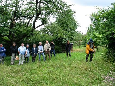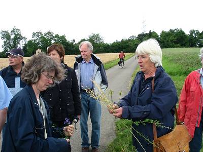 Unter Leitung der fachlichen Beraterin des Arbeitskreises Frau Inge Maass besichtigten die Teilnehmer Böschungen und Raine, welche vom Arbeitskreis gepflegt werden. Hierbei erörterte man die künftigen Pflegemaßnahmen und legte Termine für die Pflege fest. Wenig erbaut waren die Teilnehmer darüber, dass Unbekannte, Natursteinen aus den städtischen Trockenmauern die ebenfalls besonders geschützt sind, entwendet hatten. Um hier Abhilfe zu schaffen, soll künftig verstärkt kontrolliert werden. Insgesamt waren die Teilnehmer der Exkursion beeindruckt von der Zunahme der Naturschutzflächen und von der Qualität der Pflegemaßnahmen welche die gewünschten Erfolge erbracht hatten. Seinen Ausklang fand die Sommerveranstaltung bei einem gemütlichen Beisammensein mit Brezeln, Kuchen und Getränken auf dem Hof von Landwirt Hansjörg Benz.