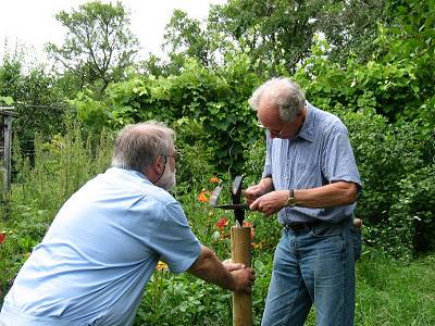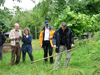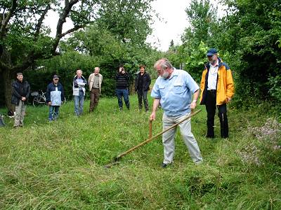 Jetzt trafen sich die Mitglieder zu ihrem gemeinsamen jährlichen Sommertermin auf einer Wiese in Zazenhausen zu einem Mäh- und Dengelkurs. Ziel der Veranstaltung war es, die Mitglieder fortzubilden und die Erfolge, welche im Arbeitskreis erzielt wurden, zu besichtigen. Joseph Michl und Jörg Faber wiesen in die Praxis der Wiesenpflege mit der Sense ein. Themen waren u. a. die verschiedenen Arten von Sensen. So gibt es etwa die kurzblättrige und robuste Freistellungssense, die bei der Auslichtung im Forst oder bei der Entbuschung eingesetzt wird. Zur Wiesenmahd werden langblättrige Grassensen verwendet. Beim Thema Kauf einer Sense riet Joseph Michl den Kursteilnehmern, sich ein handgeschmiedetes Sensenblatt zuzulegen. Weiter gingen die Referenten auf die Körperhaltung beim Mähen ein und führten die richtige Haltung und die Bewegung der Sense vor. Jetzt durften die Teilnehmer üben. Mit dabei waren Bezirksvorsteher Bernd-Marcel Löffler vom Bezirksamt Mühlhausen und Dieter Reischl vom Bezirksamt Zuffenhausen sowie Bezirksbeirat Uwe Mammel. Vom Amt für Umweltschutz der Stadt Stuttgart waren Renate Kübler und Conrad Fink vertreten. Und obwohl das Sensen nicht immer ganz profimäßig klappte, erhielten auch die „Offiziellen“ viel Lob und schafften es, in sauberen Schwaden zu mähen. Nächster Themenpunkt war das Dengeln der Sense und das zugehörige Werkzeug wie Dengeleisen und Dengelhammer. Abschließend wurde noch das Schärfen des Sensenblattes mit dem Wetzstein geübt.