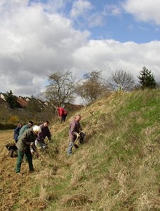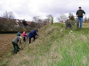 Die Zeit war günstig und die Helfer des Biotoppflegeverbundes Zuffenhausen-Zazenhausen-Mühlhausen motiviert. Am Samstag trafen sich die Naturschützer von der ARGE Nord-Ost und dem Bürgerverein Zazenhausen, um eine Magerrasenwiese am Bisachgraben zu pflegen. Die wildwuchernden Brombeeren behinderten das Wachstum und die Verbreitung von "Rundem Lauch" und "Aufrechtem Ziest". Nur mit dem unerbittlichen Einsatz von Spaten und Hacke gegen die Wurzeln der wilden Brombeeren konnte Abhilfe geschaffen werden.