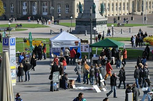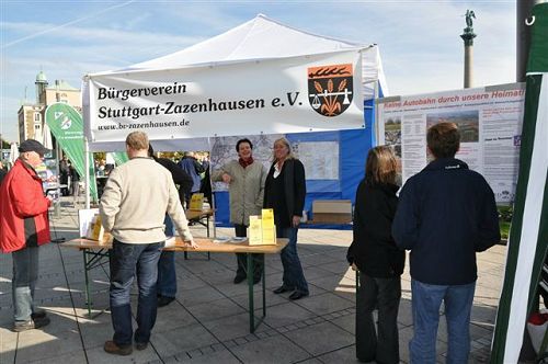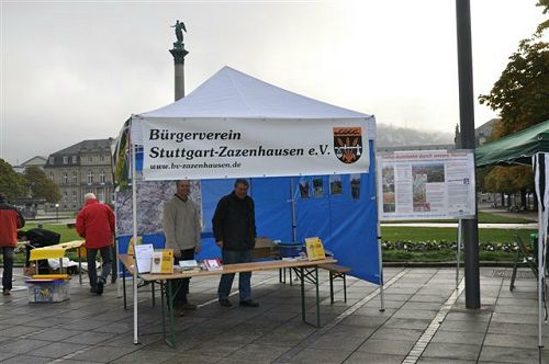 Unter dem Motto "Stuttgarter Bürgervereine stellen sich vor" bestand für die Mitgliedsvereine der ASB (Arbeitsgemeinschaft Stuttgarter Bürgervereine) die Möglichkeit, Bürger über ihre Arbeit zu informieren, ins Gespräch zu kommen, geschichtliche Bücher, Broschüren, Hefte oder ähnliches zu präsentieren. Am Samstag, den 24.10.2009 hatte auch der BVZ zwischen 10 und 16 Uhr sein "Zelt" auf dem Schloßplatz gegenüber der Treppe zum "ehem. Kleinen Schloßplatz" aufgeschlagen. Das "Aufbaukommando" bestand aus Michael Röger, Reinhold Weible und Ulrich Kunzmann. Von der ARGE Nordost wurde uns freundlicherweise ein 3 m x 3 m großer Pavillon ausgeliehen. An diesem befestigte das Team das BVZ- sowie das ARGE-Banner. Auf zwei Biertischen konnten wir den Interessenten diverses Infomaterial präsentieren, wie die Informations Flyer BV-Zazenhausen, 1200 Jahre Zazenhausen, ARGE Nordost und div. Flyer über Biotoppflege im Stuttgarter Norden. Daneben wurden die Bücher "1200 Jahre Zazenhausen" und das "Zazenhäuser Kochbüchle" zum Verkauf angeboten. Abgerundet wurde die Standpräsentation durch Infoplakate der ARGE Nordost über den geplanten Verlauf des Nordostrings. Später übernahmen Bea Jacob und Nicole Gassmann den Standdienst.