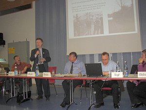 Bezirksvorsteher Wolfgang Meyle (stehend) nimmt zu Fragen Stellung