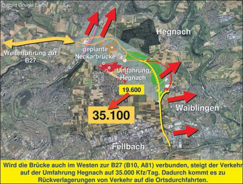 Aus Sicht der Arge gibt es für Hegnach deshalb nur eine sinnvolle Lösung: Man baue eine zweite Neckarquerung (die sogenannte Billinger-Brücke) unweit der bestehenden und führe von dort aus den Verkehr auf bereits vorhandenen Straßen über eine ortsnahe Hegnacher Kleinumfahrung auf die Waiblinger Westtangente. Nur das, glaubt Joseph Michl, würde dem lokalen Verkehr helfen, ohne überregionalen Verkehr anzulocken.