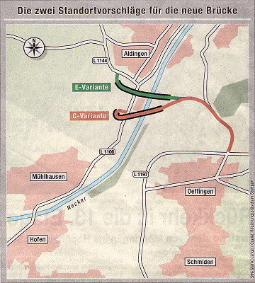 Regierungspräsident Andriof bekommt es Anfang Februar wohl schwarz auf weiß: Für die Entlastung der Neckarbrücke in Neckarrems und die bessere Verbindung der Verkehrswege beidseits des Neckars im Raum Remseck sowie Fellbach/Waiblingen favorisiert Stuttgart die so genannte E/4.3-Trasse: eine Brücke über den Neckar beim Stadtbahnbetriebshof Remseck, nicht weiter südlich beim Stuttgarter Haupt- klärwerk. Diese von der Stadtverwaltung empfohlene Stellungnahme zur Neckarquerung der L 1197 ist am Dienstag vom Ausschuss für Umwelt und Technik wohlwollend aufgenommen worden, entschieden werden soll aber erst am 7. Februar. Die Ablehnung der Variante C 1, die sich das RP wünscht, weil diese Brücke leichter in einen Nordostring einbezogen werden könne, scheint aber sicher. Andriof und die Stadt sind damit auf Kollisionskurs.