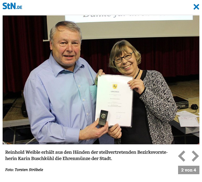 Den ausscheidenden Vorstandsmitgliedern wird für ihre geleistete Arbeit gedankt und ihnen werden Geschenke (Blumen, Wein, …) übergeben. Die stellvertretende Bezirksvorsteherin Karin Buschkühl überreicht Reinhold Weible die Ehrenmünze der Stadt Stuttgart.